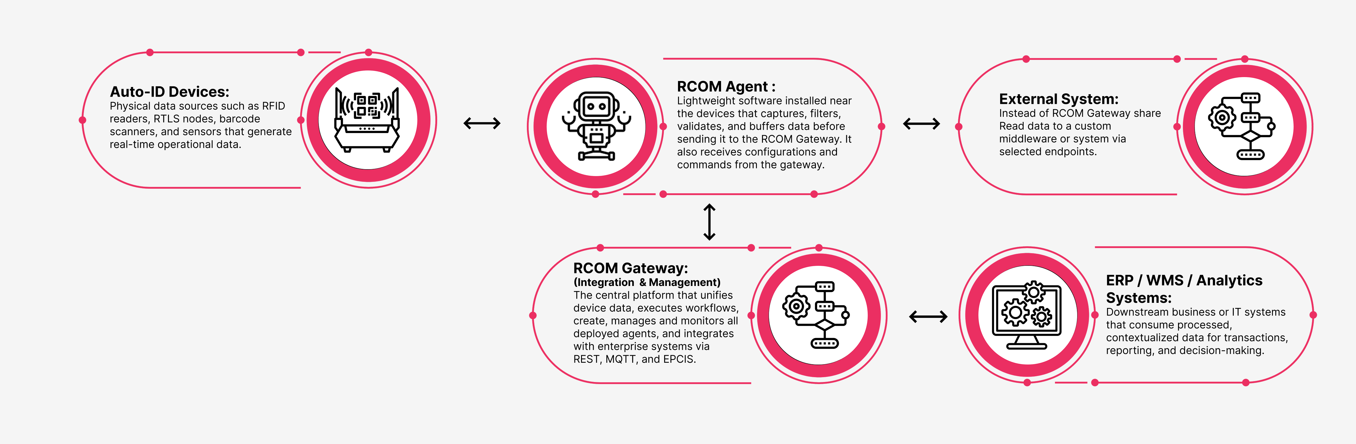 RCOM Agents act as local data gateways for your Auto-ID and sensor infrastructure. Installed on an on-premise PC, edge controller, or embedded device, the agent: