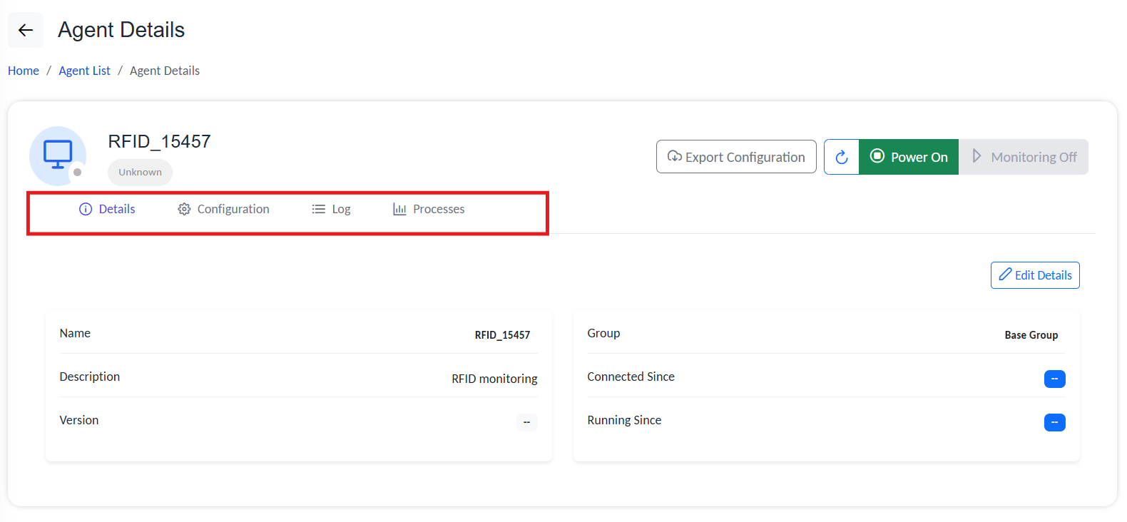 As the agent is registered, click on the agent edit button to open Agent Details. The interface includes four tabs: