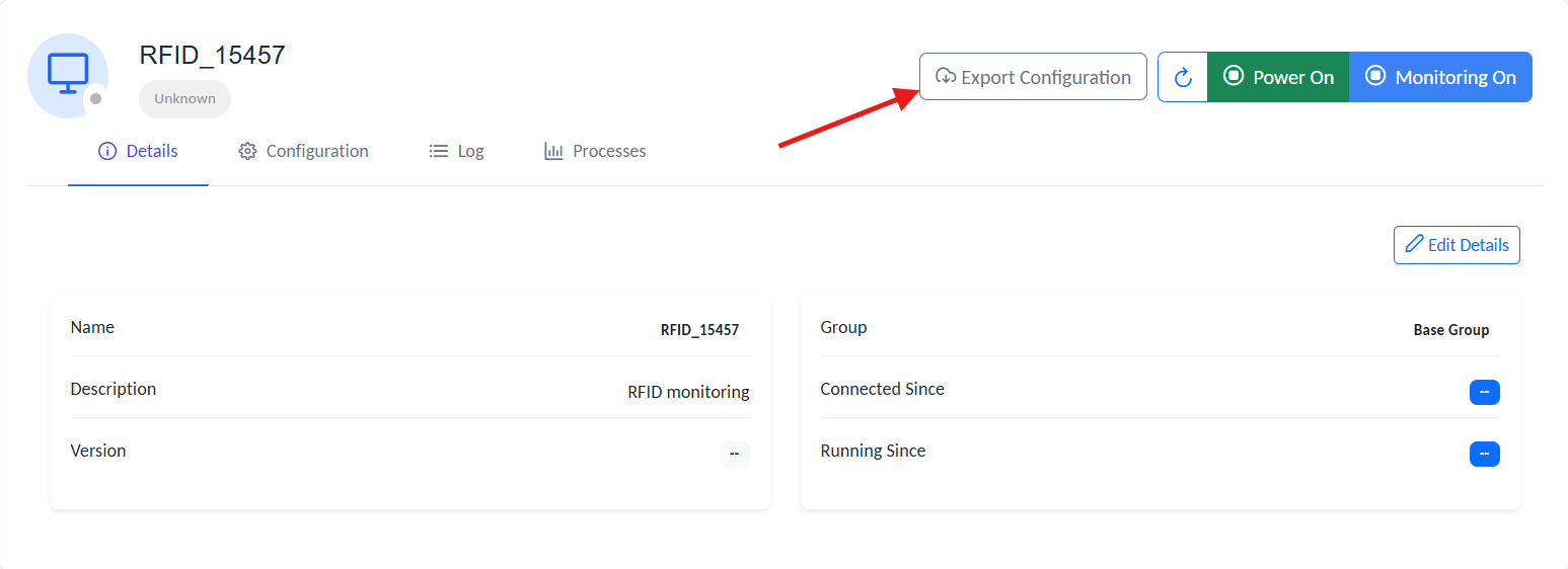 From the Agent configuration page, click Export Configuration to generate a JSON file containing connection details, process mappings, and operational parameters.