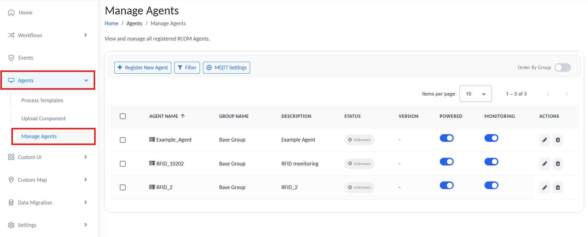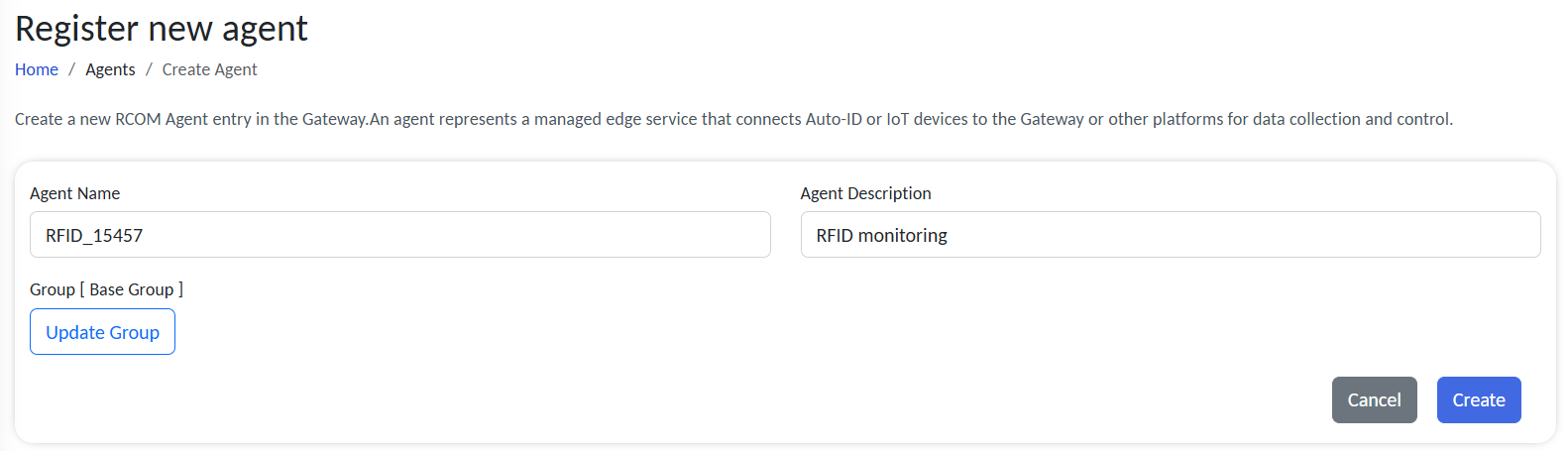 Registering an agent in the Gateway UI only creates its managed identity. To activate it, you must install and link the RCOM Agent on the target edge host where the actual device integration occurs.
