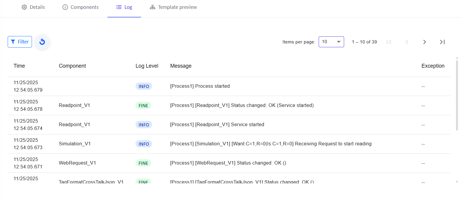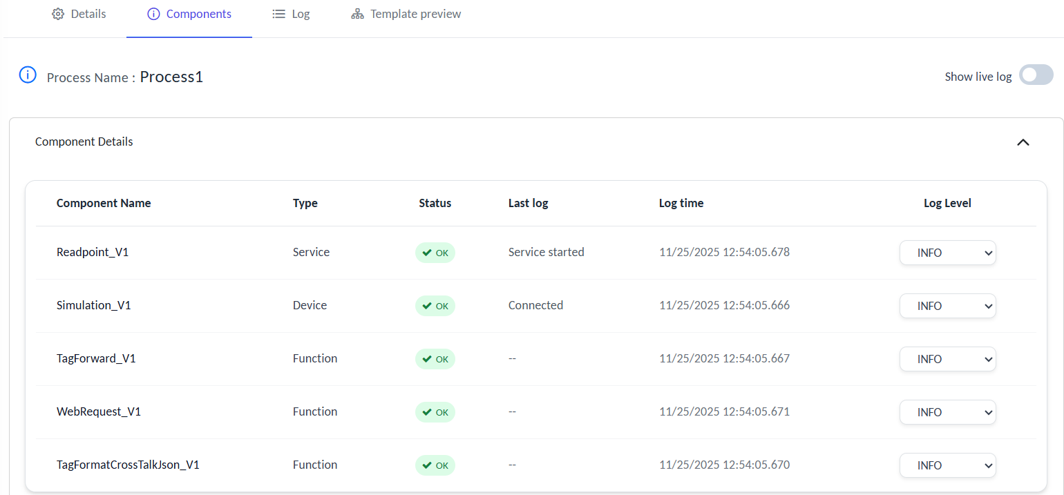 - Components – The page lists all process components, including their type, last known status, and most recent log entry for each component.