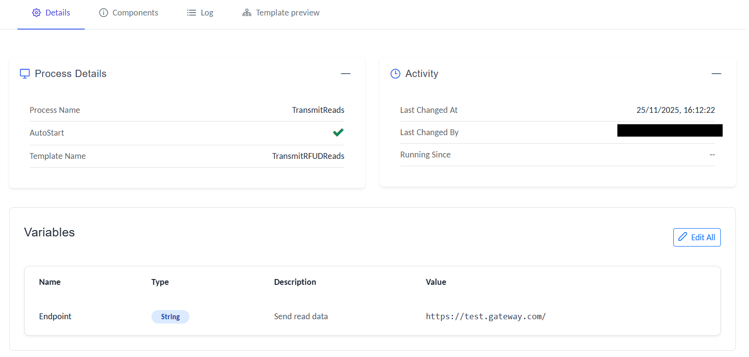 - Details – This section include basic process details, such as process name, template name, running status, and update information along with option to override any varibles defined from the process template configuration so that this instance of the process can use a different variables.