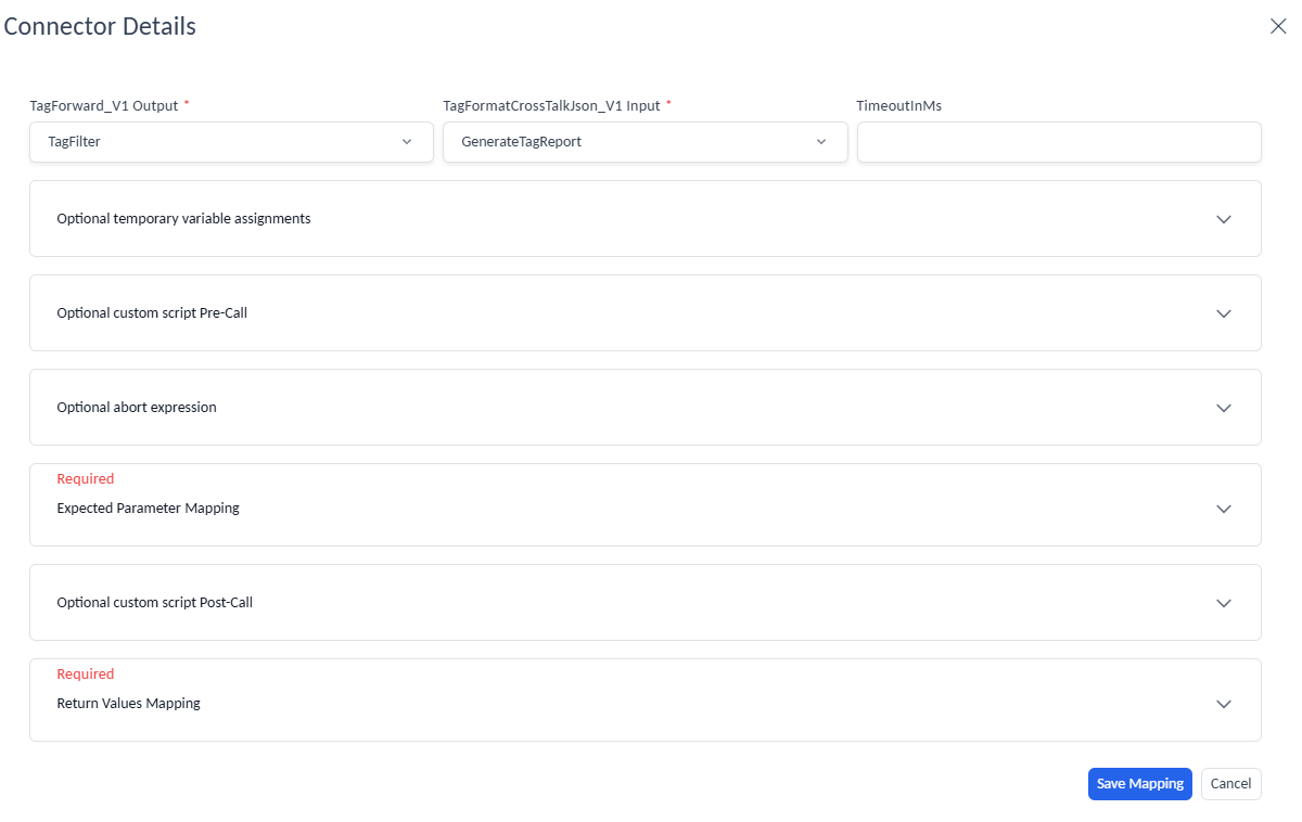 - Return Values Mapping: Defines the output values that the following module must return to the preceding processing block. Return values are only applicable for selected blocks that have a return value.