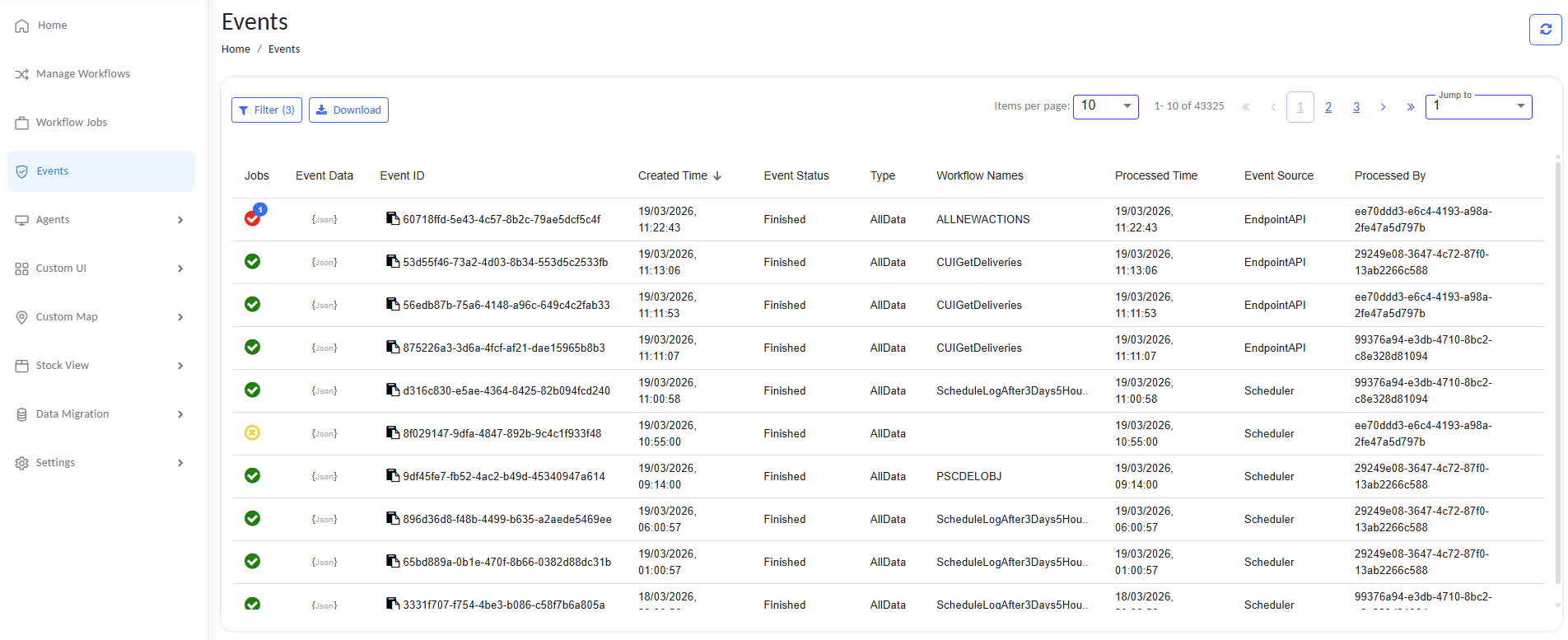 The Events Page provides a centralized interface for viewing, analyzing, and troubleshooting all events processed by the system. It acts as the primary operational console for system visibility.