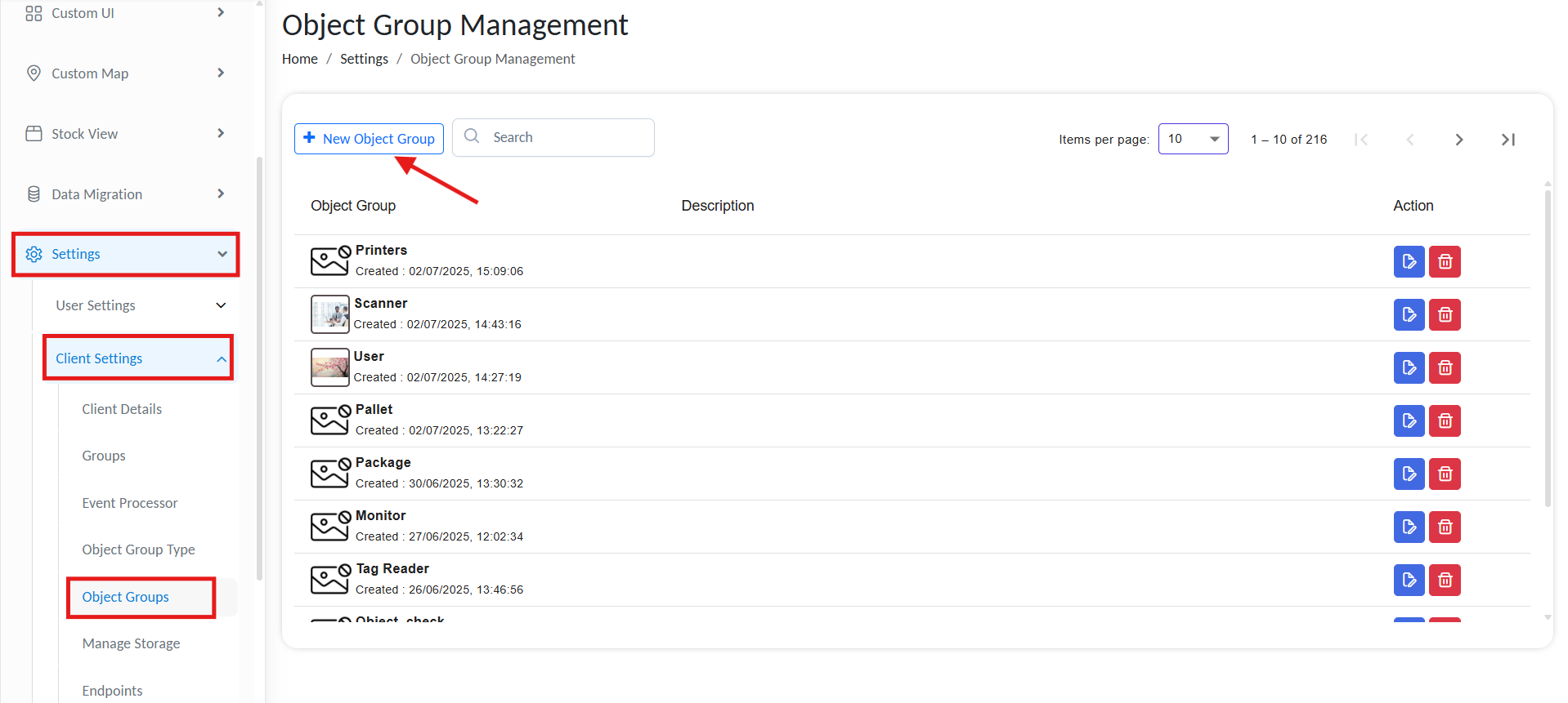 - Go to Settings > Client Settings > Object Groups. This page lists all available object groups.
