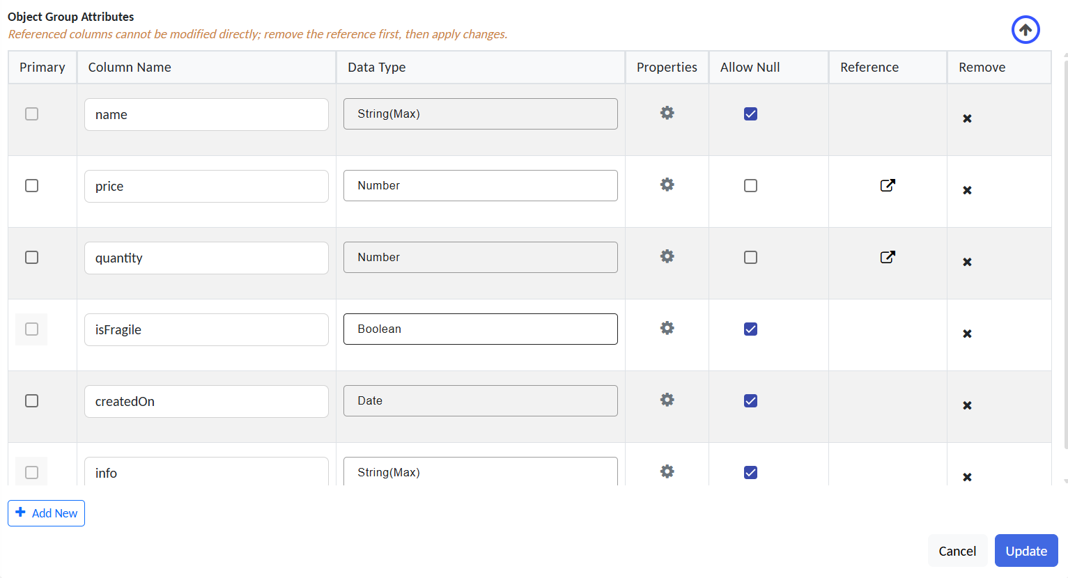| Reference (Optional) | Links this attribute to a field in another Object Group (similar to a foreign key). Example: assignedDepartmentID referencing DepartmentID in a Departments group. |