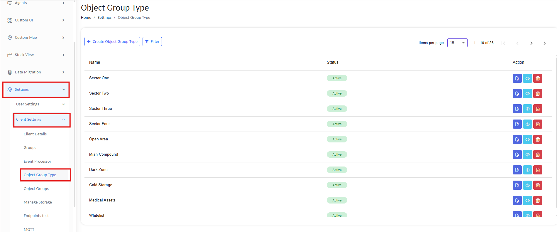 This page lists all existing Object Group Types along with their status and available actions (edit, delete).