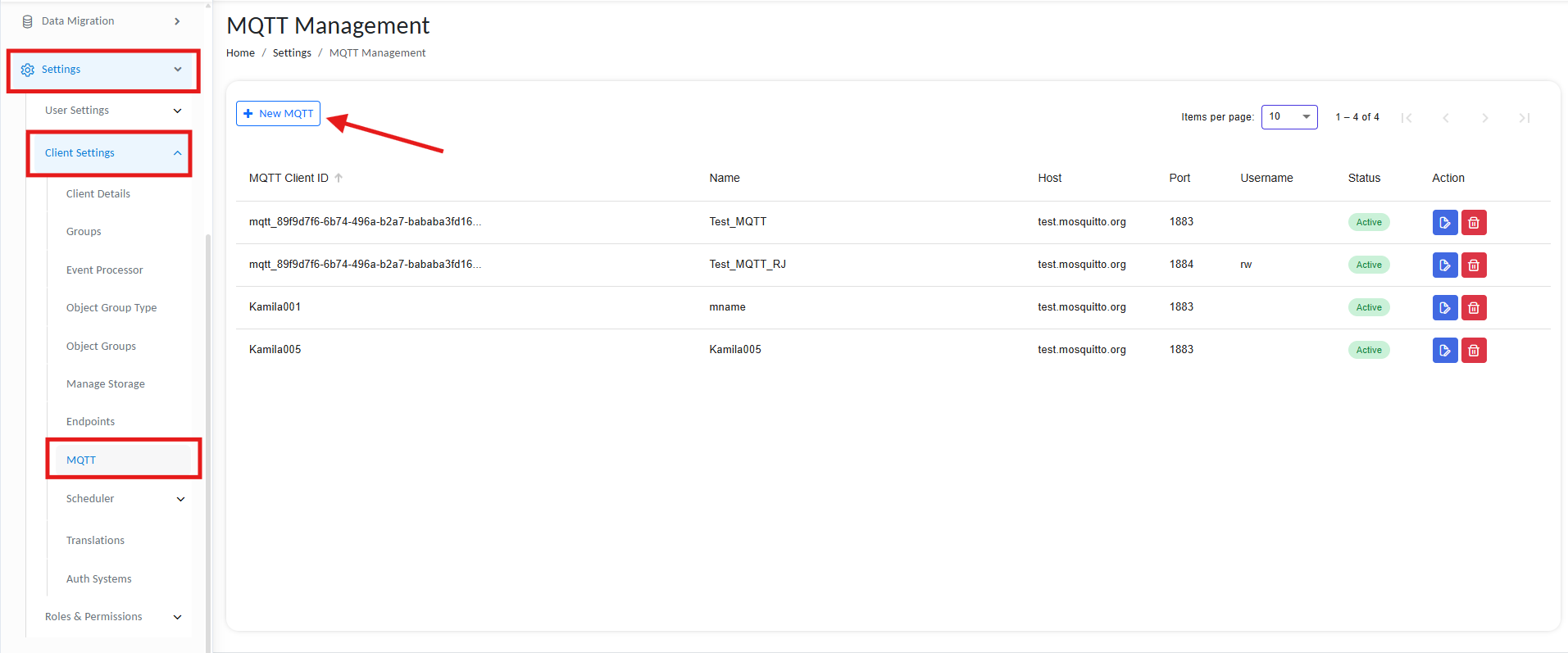 Your MQTT connection will appear in the management list with an Active status if successful.