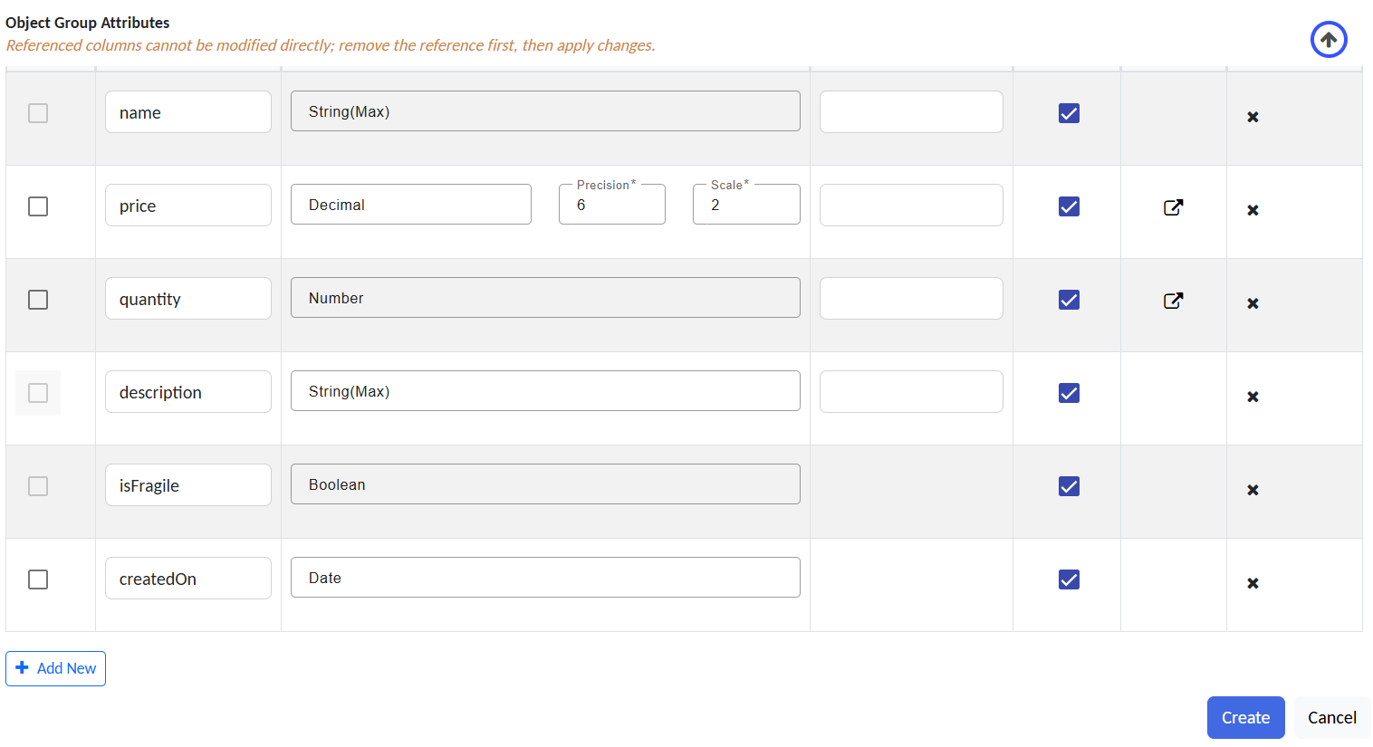 name,price,qty,isFragile,createdOn)
