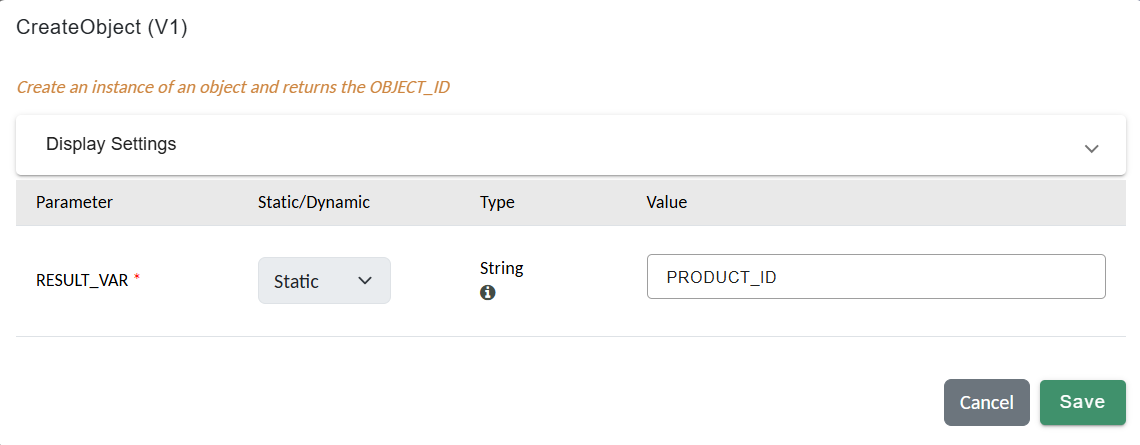 RESULT_VAR = CreatedOn(Static • String)- The timestamp object will be saved in