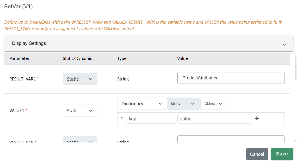 SetVar action to create an empty dictionary for product attributes.