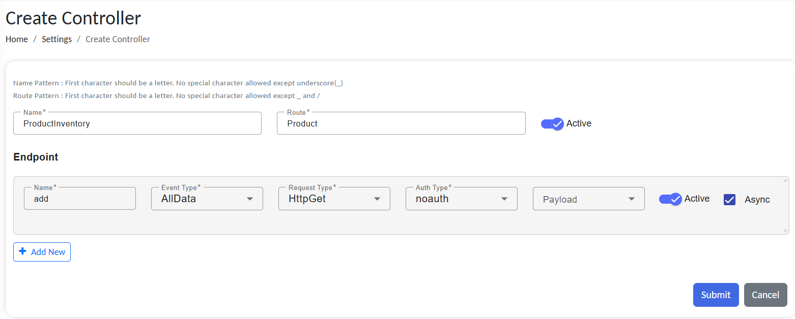 /RCOMENDPOINTAPI/inventory/addProduct). - Create an Event Processor: