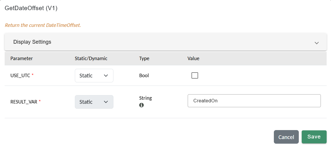 GetDateOffset action configured to store current timestamp.