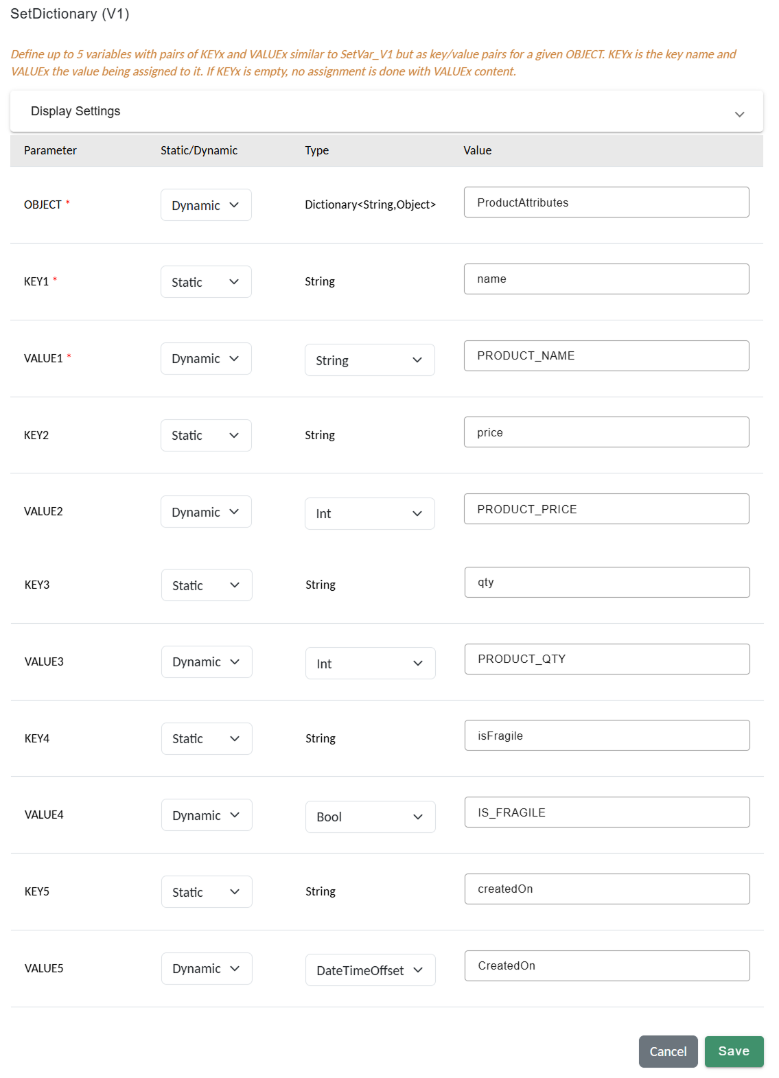 SetDictionary action with keys and corresponding typed values.