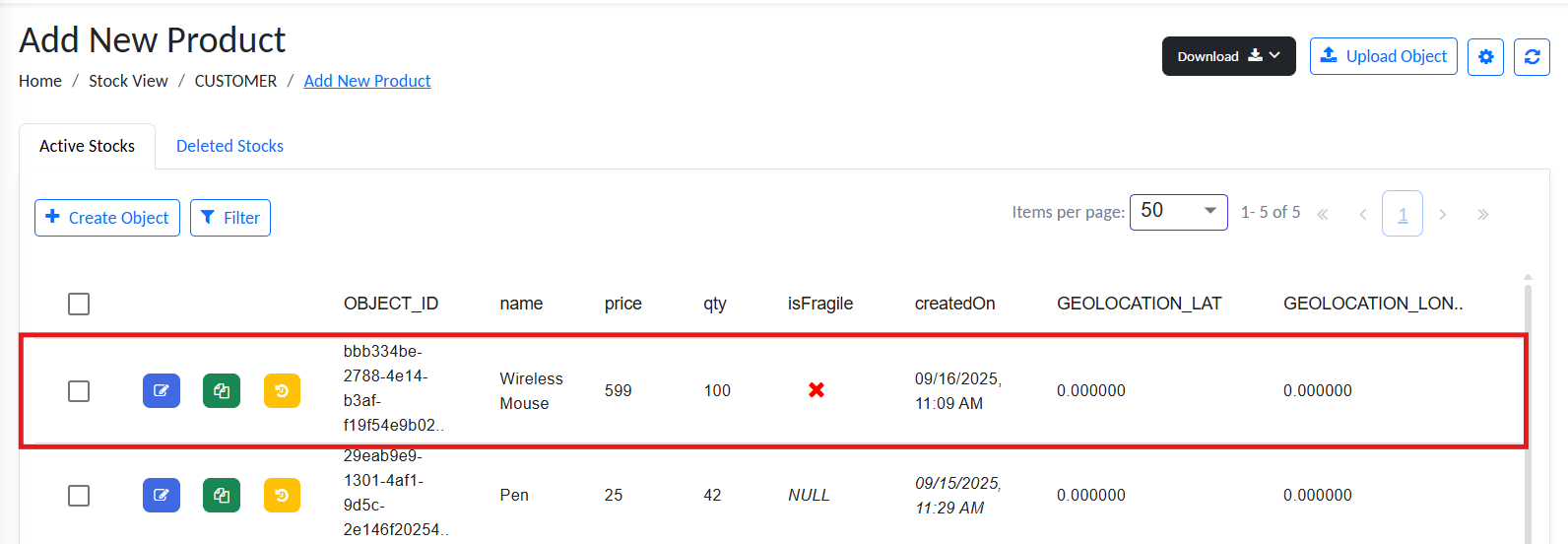 Expected result: New object added to inventory (Listed under Stock View)