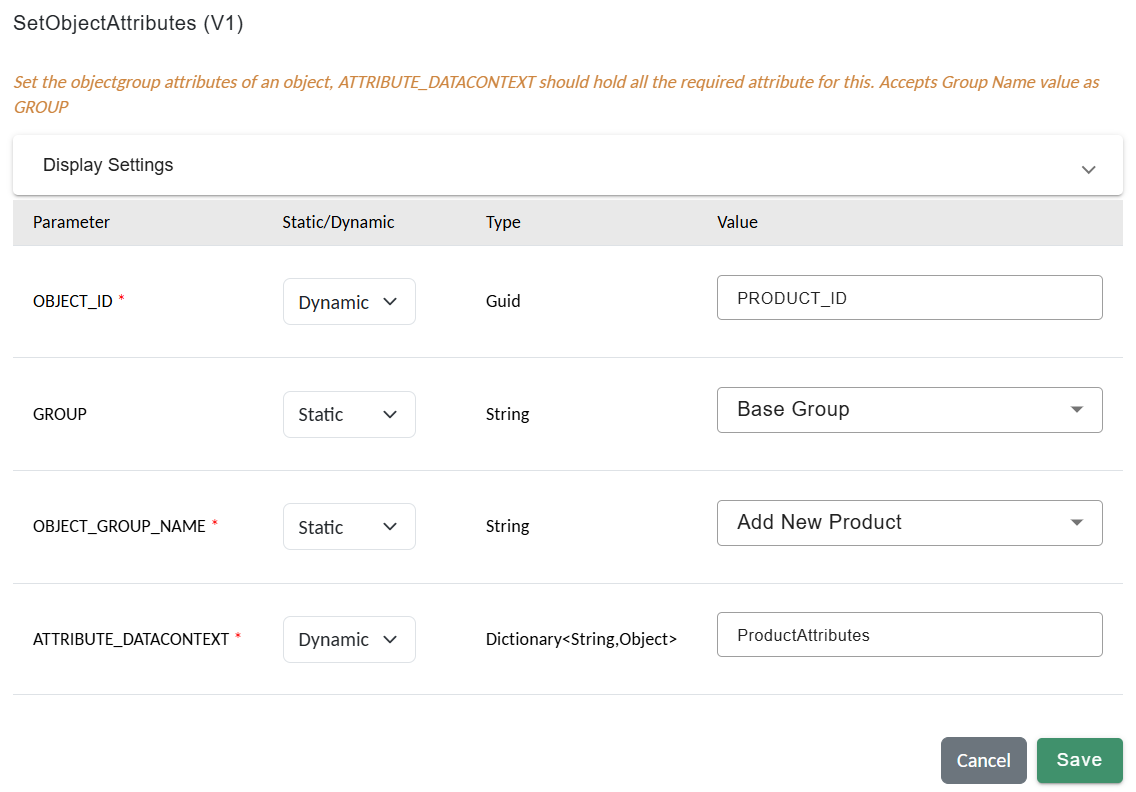 SetObjectAttributes action to persist product data to the object group.
