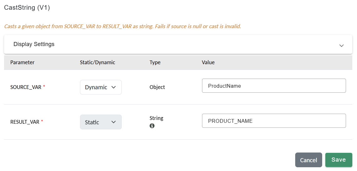 JsonPath ($.name)→RESULT_VAR = ProductNameCastString→RESULT_VAR = PRODUCT_NAME