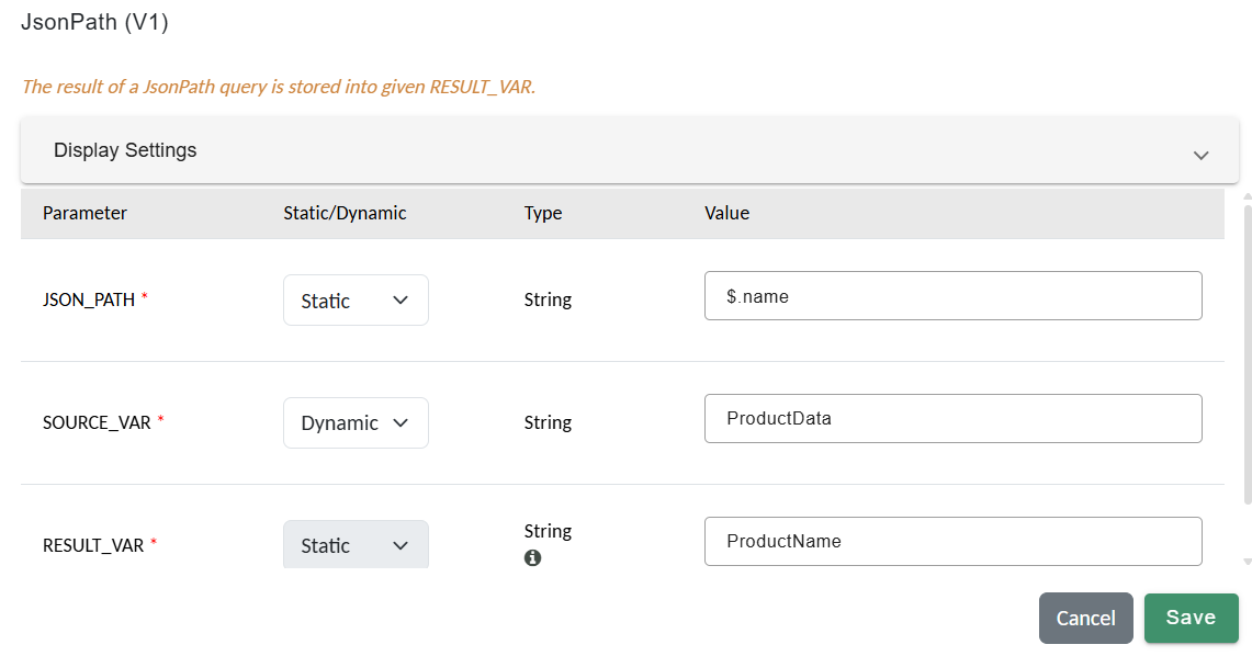 JsonPath→ use when you want a string-like result. This can also be achieved byJsonPathValue.JsonPathValue→ use when you need a specific typed result. SetRESULT_TYPEtoString,Int, orBool.