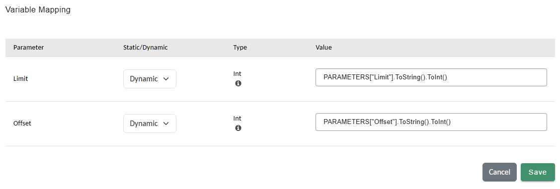 | Offset | PARAMETERS["offset"].ToString().ToInt() |